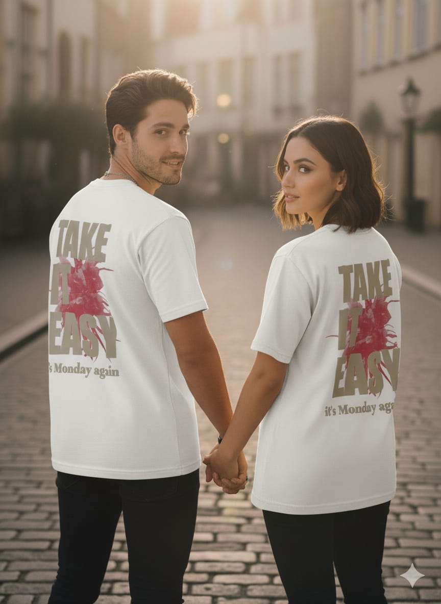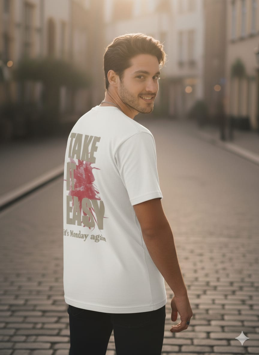 The back is more expressive, with a large, eye-catching graphic. The phrase “TAKE IT EASY” is printed in big block letters, overlaying a striking illustration of red-orange flowers. The typography and floral artwork blend together, giving a strong mix of calm vibes and streetwear edge. -